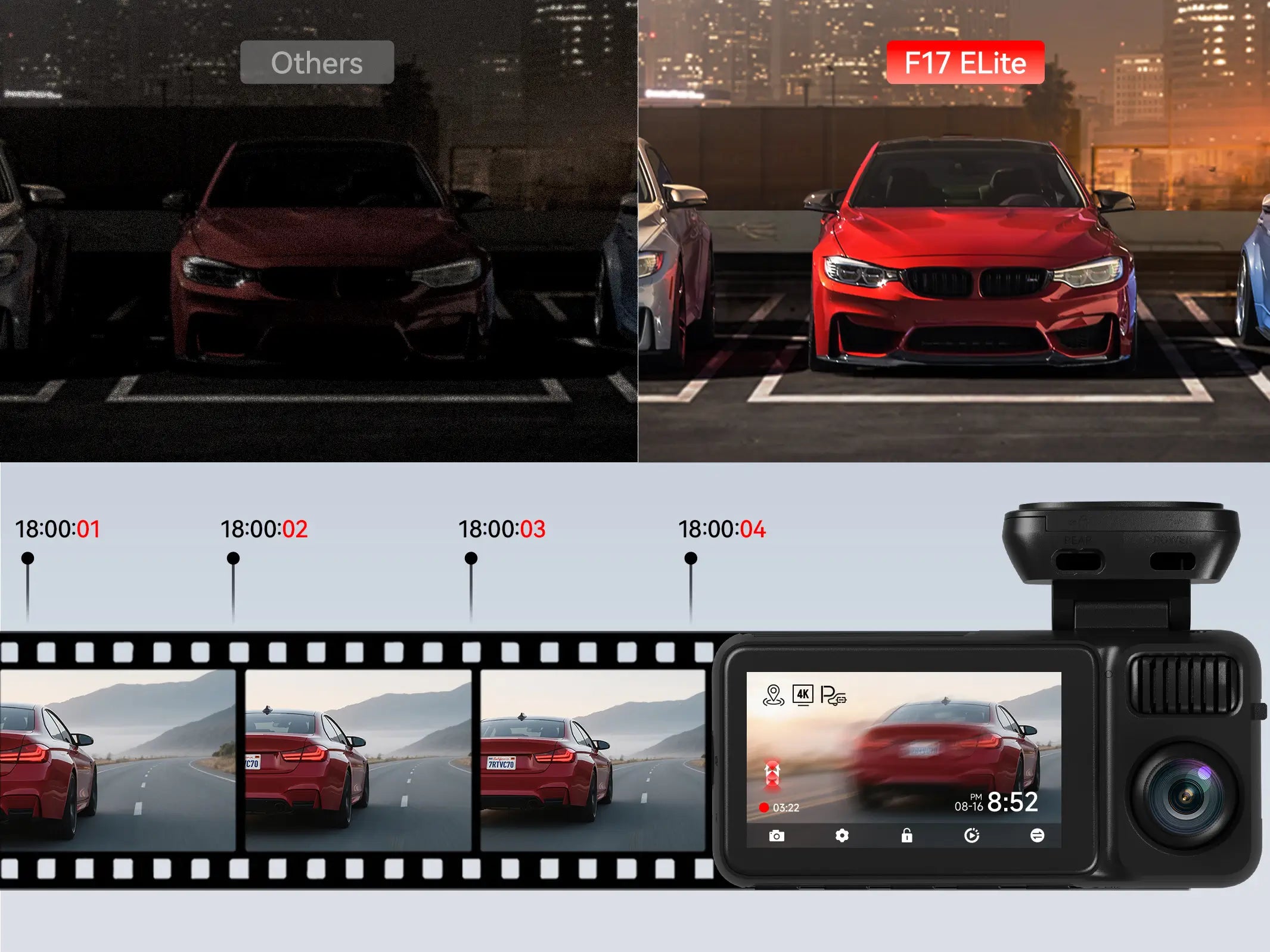 When you park at night in alow-light dark area, other dash cams’ parking monitor mode almost becomes useless — but not with the F17 Elite,which records videos as if it were daytime!