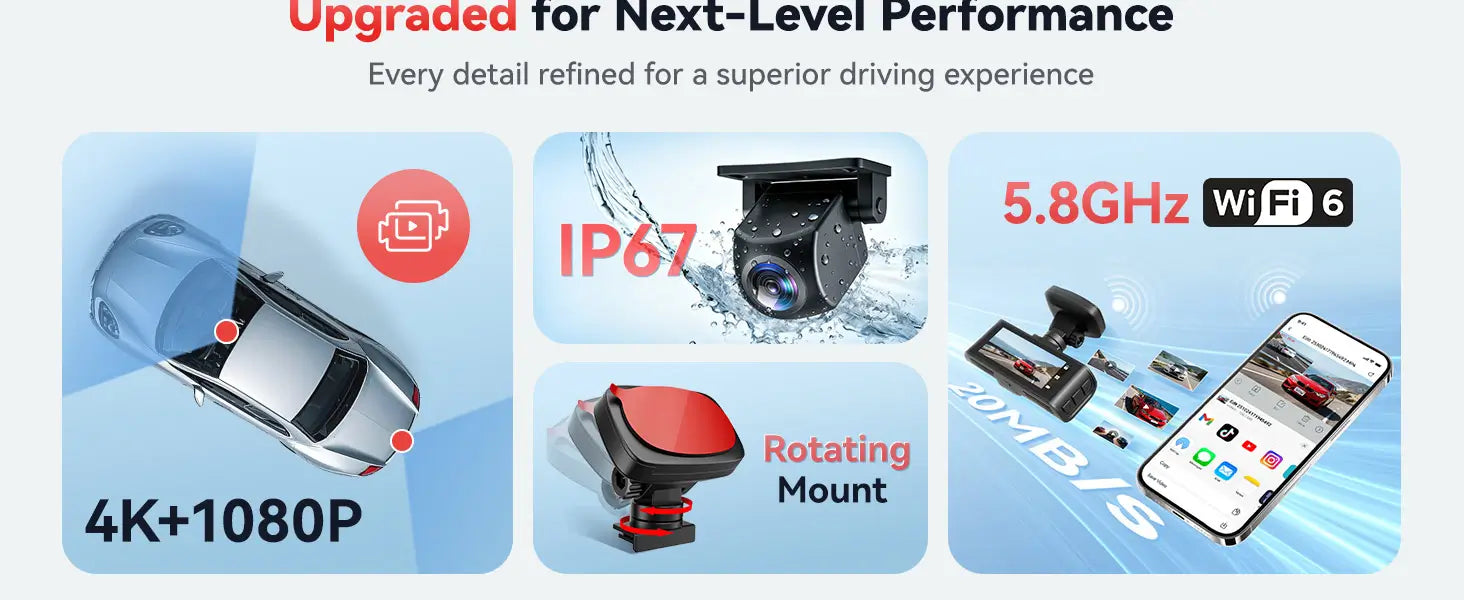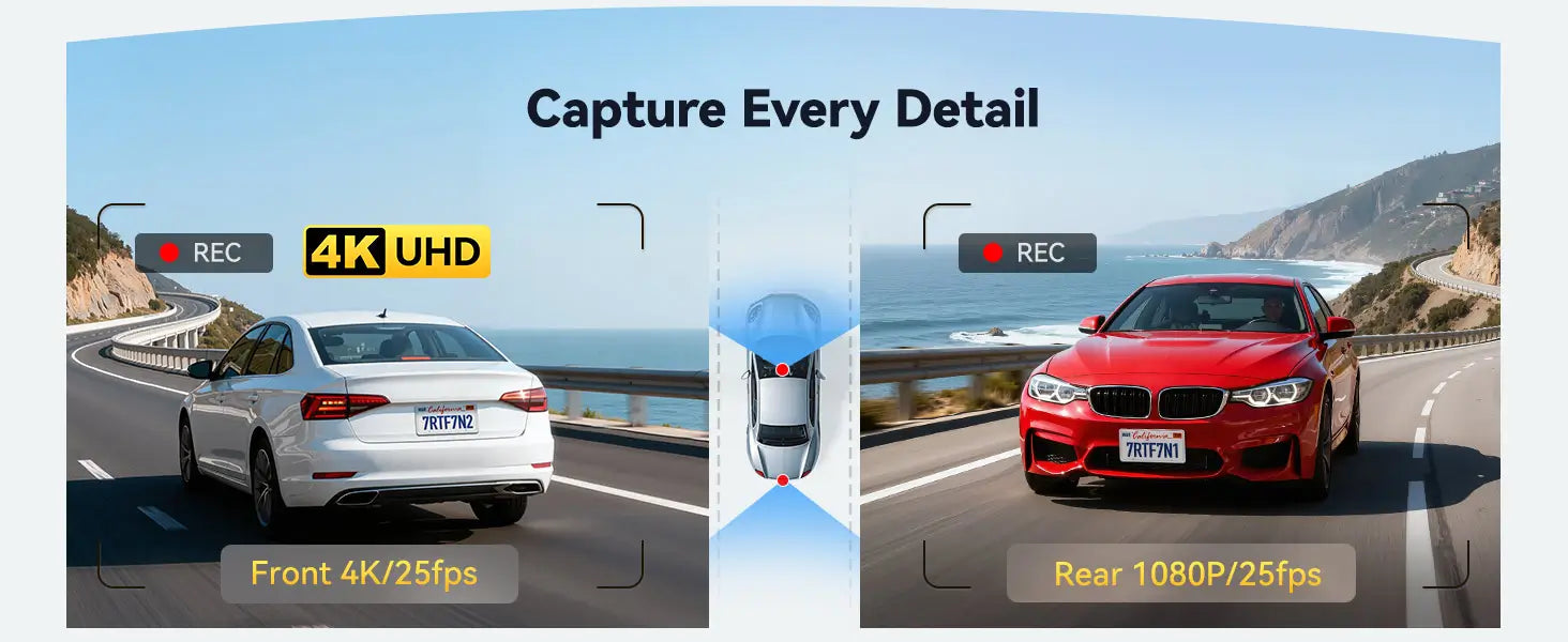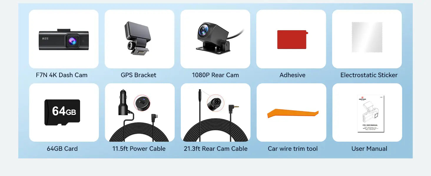 • F7N:4K Front Dash Cam+ Hardwire kit+ 1080P Water Proof Rear Camera+ 18-Months Warranty