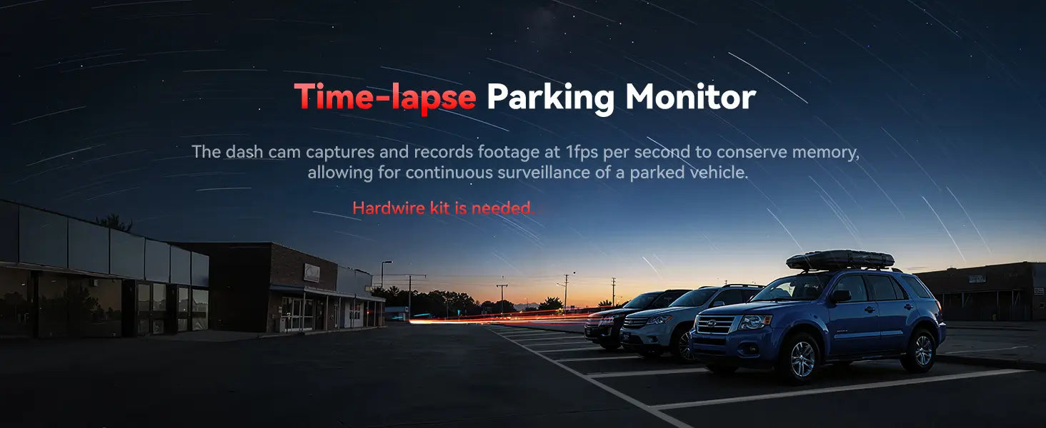 - [24/7 Parking Mode* & G-Sensor] Enjoy round-the-clock protection with two parking modes: time-lapse recording for continuous low-bitrate monitoring and G-sensor mode that records when collision is detected. The car security camera with G-sensor automatically locks important clips, ensuring crucial evidence is safely preserved even while your vehicle is parked.(*Hardwire kit needed.)