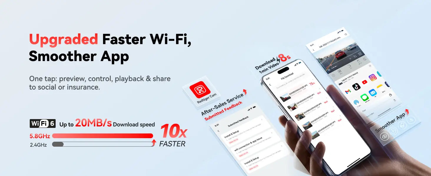 - [Built-in 5.8GHz WiFi & Smart App] Connect your smartphone to the dashcam’s built-in 5.8GHz WiFi to enjoy ultra-fast downloads up to 20MB/s. Using Redtiger Cam app, you can preview, download, and replay videos in real time, check GPS ata (route, speed, and location), and manage settings effortlessly, making it simple to review footage and share important moments.