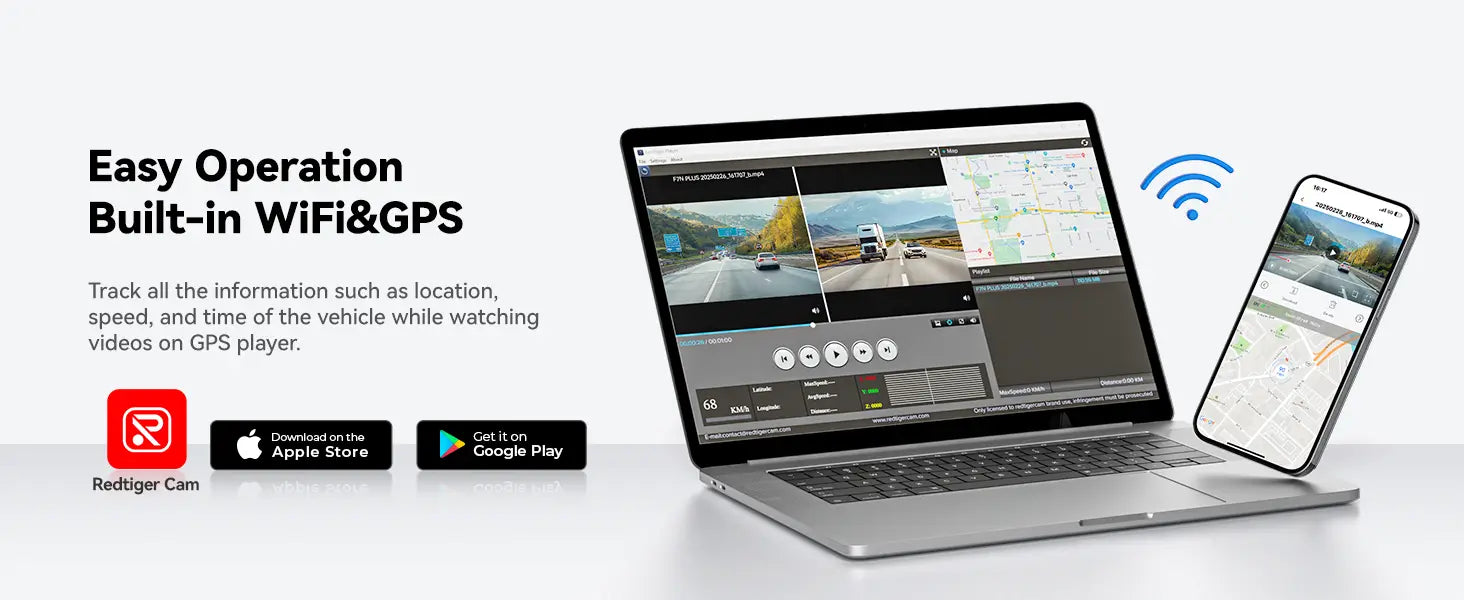 - DASH CAM WITH GPS- REDTIGER F7NP dash cam has a built-in GPS and records the driving route, real-time speed, location, etc. You can track on google maps via Wi-Fi using the App or with our Windows and Mac GPSPlayer, which will provide further additional evidence if an accident occurs.