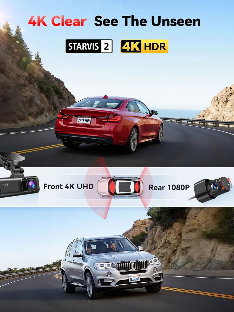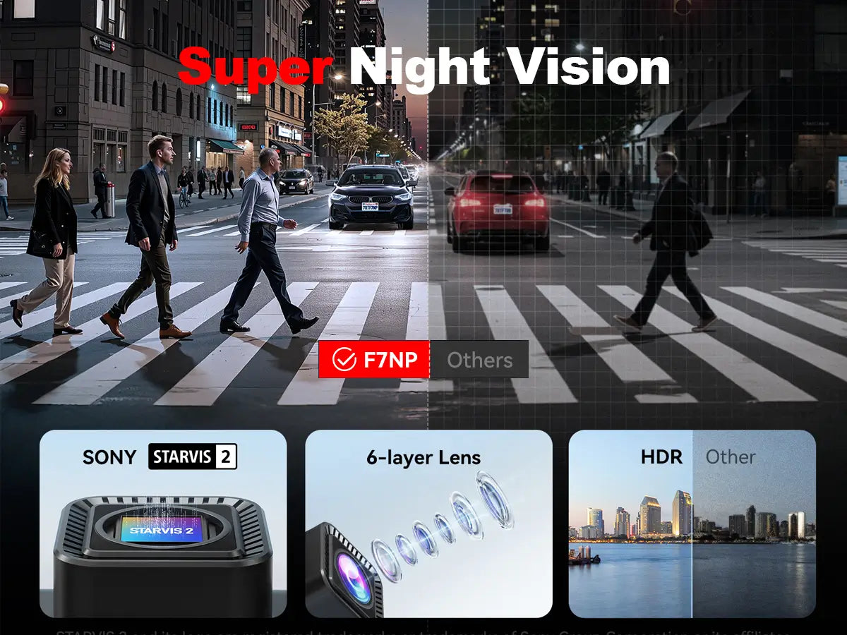- [STARVIS 2 Sensor & WDR Night Vision] Equipped with the advanced STARVIS 2 sensor, F1.5 large aperture, and 6-layer optical lens, F7NP 4K dual dash cam delivers clear, high-contrast footage in any lighting. WDR and HDR technology balance highlights and shadows, ensuring sharp night vision and crisp details day or night, providing reliable evidence and enhanced safety for every drive.