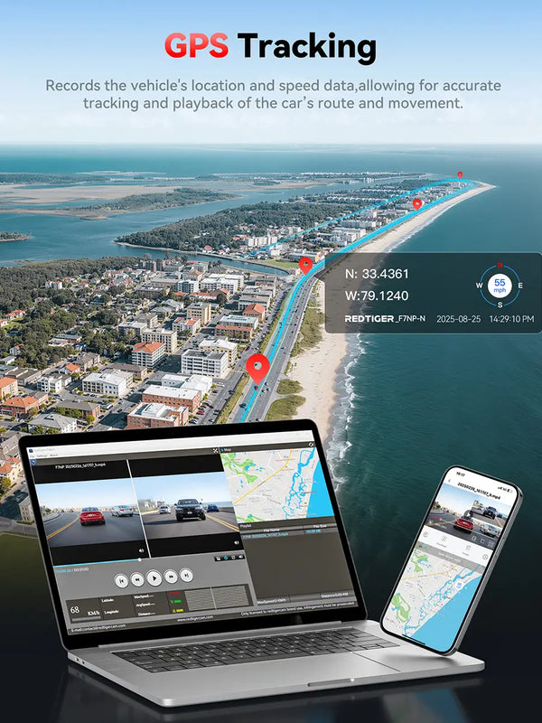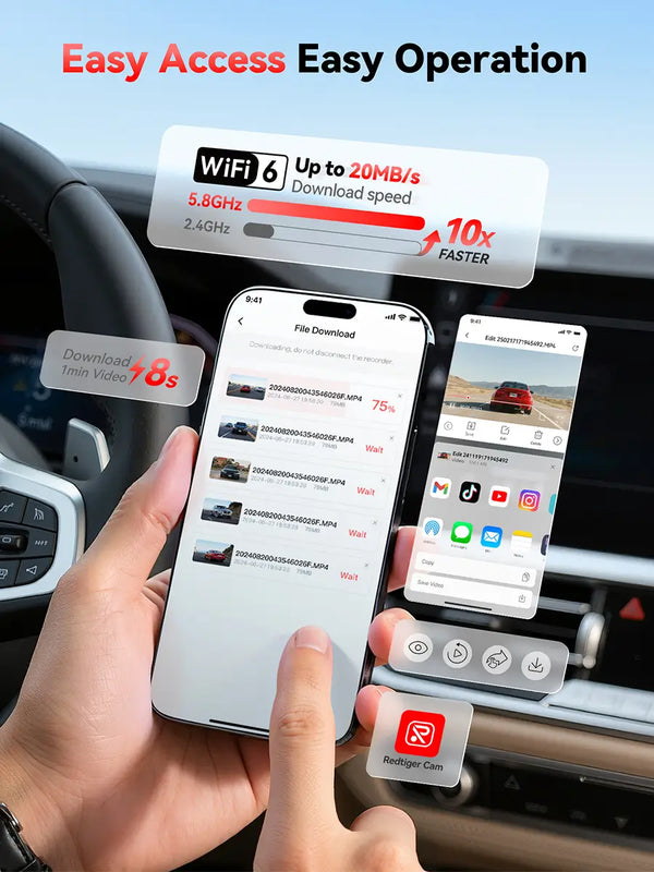 - [Built-in 5.8GHz WiFi & Smart App] Connect your smartphone to the dashcam’s built-in 5.8GHz WiFi to enjoy ultra-fast downloads up to 20MB/s. Using Redtiger Cam app, you can preview, download, and replay videos in real time, check GPS ata (route, speed, and location), and manage settings effortlessly, making it simple to review footage and share important moments.