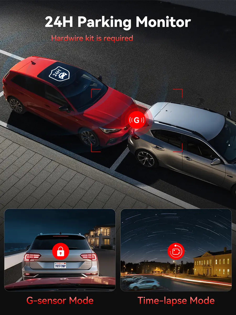 - [24/7 Parking Mode* & G-Sensor] Enjoy round-the-clock protection with two parking modes: time-lapse recording for continuous low-bitrate monitoring and G-sensor mode that records when collision is detected. The car security camera with G-sensor automatically locks important clips, ensuring crucial evidence is safely preserved even while your vehicle is parked.(*Hardwire kit needed.)