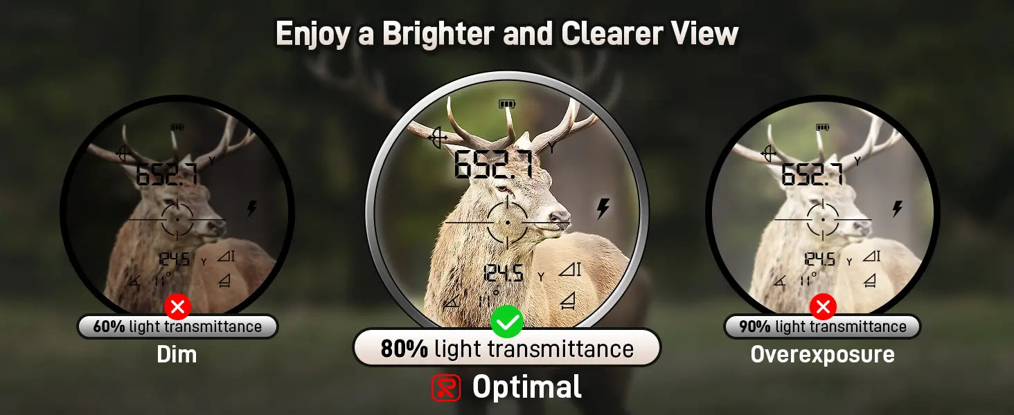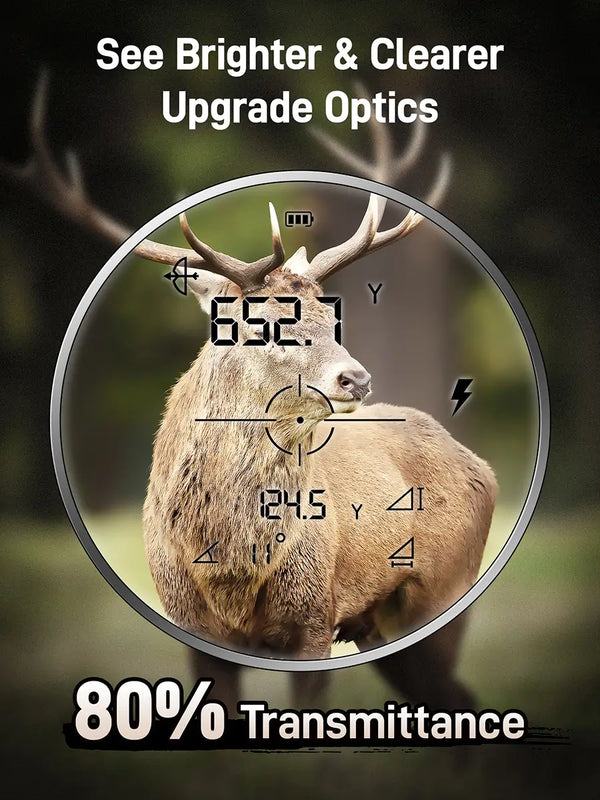 - [Crystal-clear Optics]Through lenses with light transmission up to 80% and HD LCD display, the hunting rangefinder delivers unparalleled clarity and visibility even in challenging lighting conditions. Precisely assess to surroundings and range targets with ease, whether it's for hunting, archery, or bowhunting.