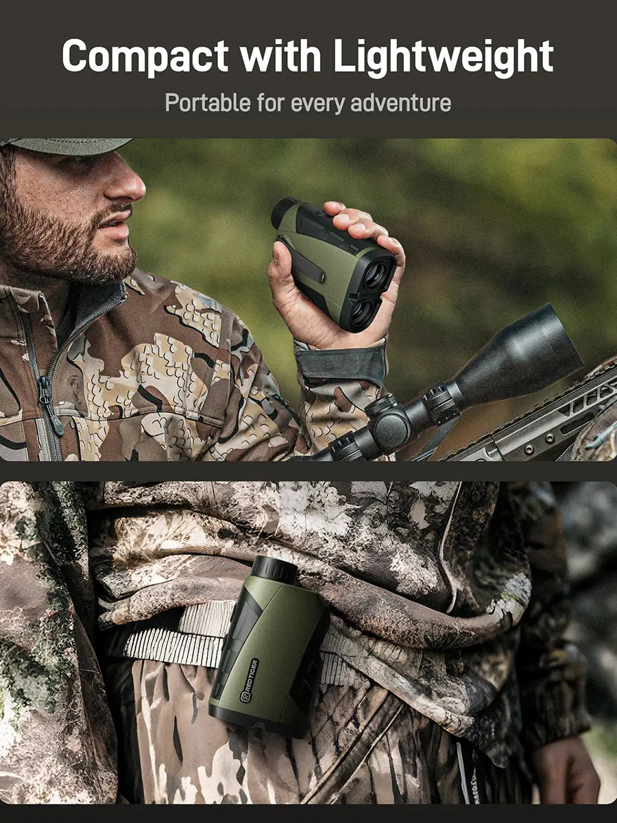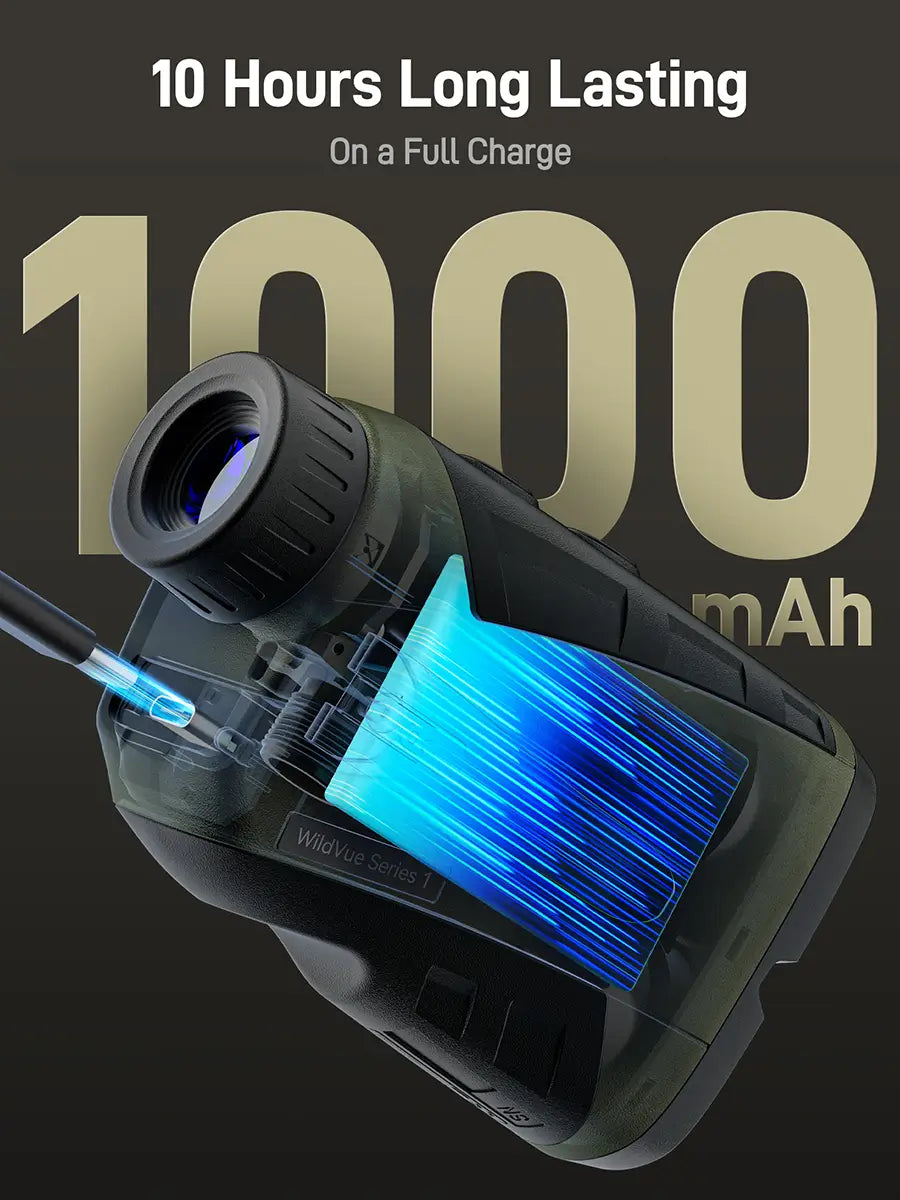 - [Effortless Design] Upgrade rechargeable battery from 750mAh to 1000mAh, up to 8000 measurements on a full charge ensures long hunting trips. 0.35lb lightweight combines ergonomic design make the rangefinder comfortable handling, IP54 waterproof rating provide durability in any weather conditions.