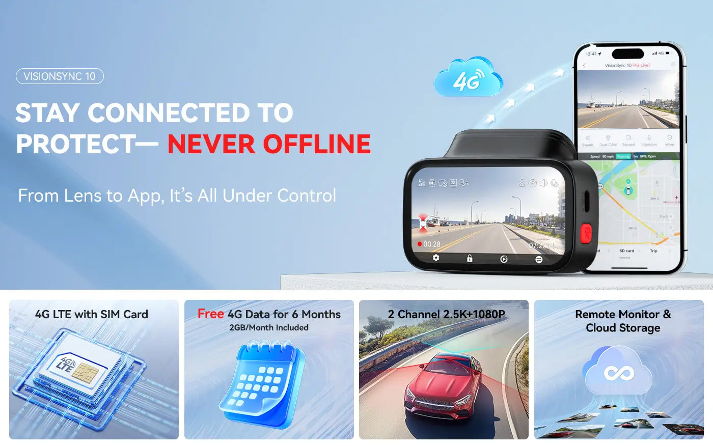 • Reliable 4G LTE Remote Access: Equipped with a built-in 4G SIM card, enjoy features like live monitoring, GPS tracking, collision alerts, and cloud storage!