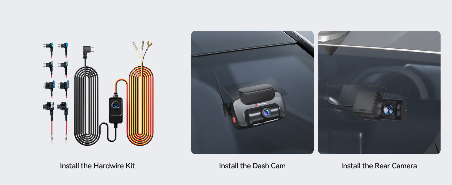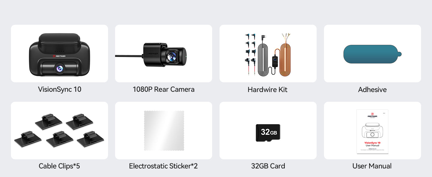 • VS10: 2.5K Front + 1080P Incar Rear + 32GB SD Card + Hardwire Kit + 18-Months Warranty.