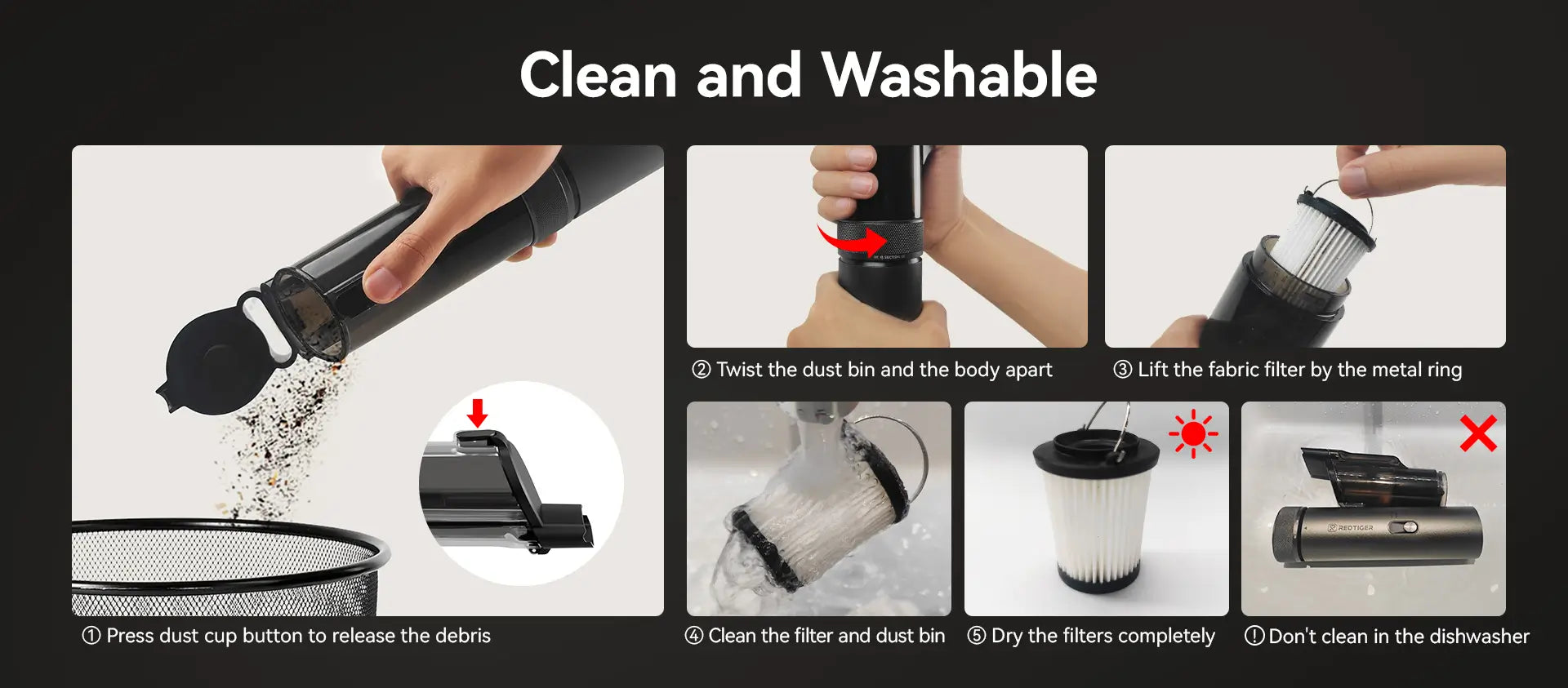 - Self-Cleaning Function: Easy one-touch lid for automatic debris disposal, keeping your hands clean. The HEPA filter captures fine dust and particles, and it’s washable for reuse.