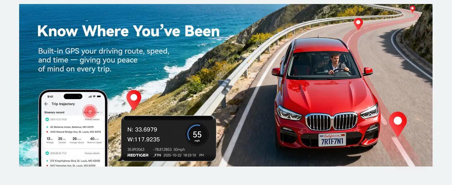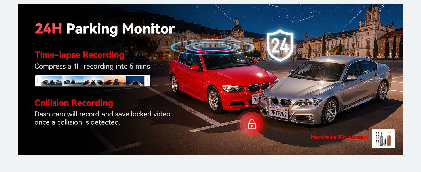 • Featuring with 170° Wide Angle, 24/7 Parking monitoring (Free Hardwire kit), WiFi & App control, GPS trucking, Super Night Vision, Loop Recording!